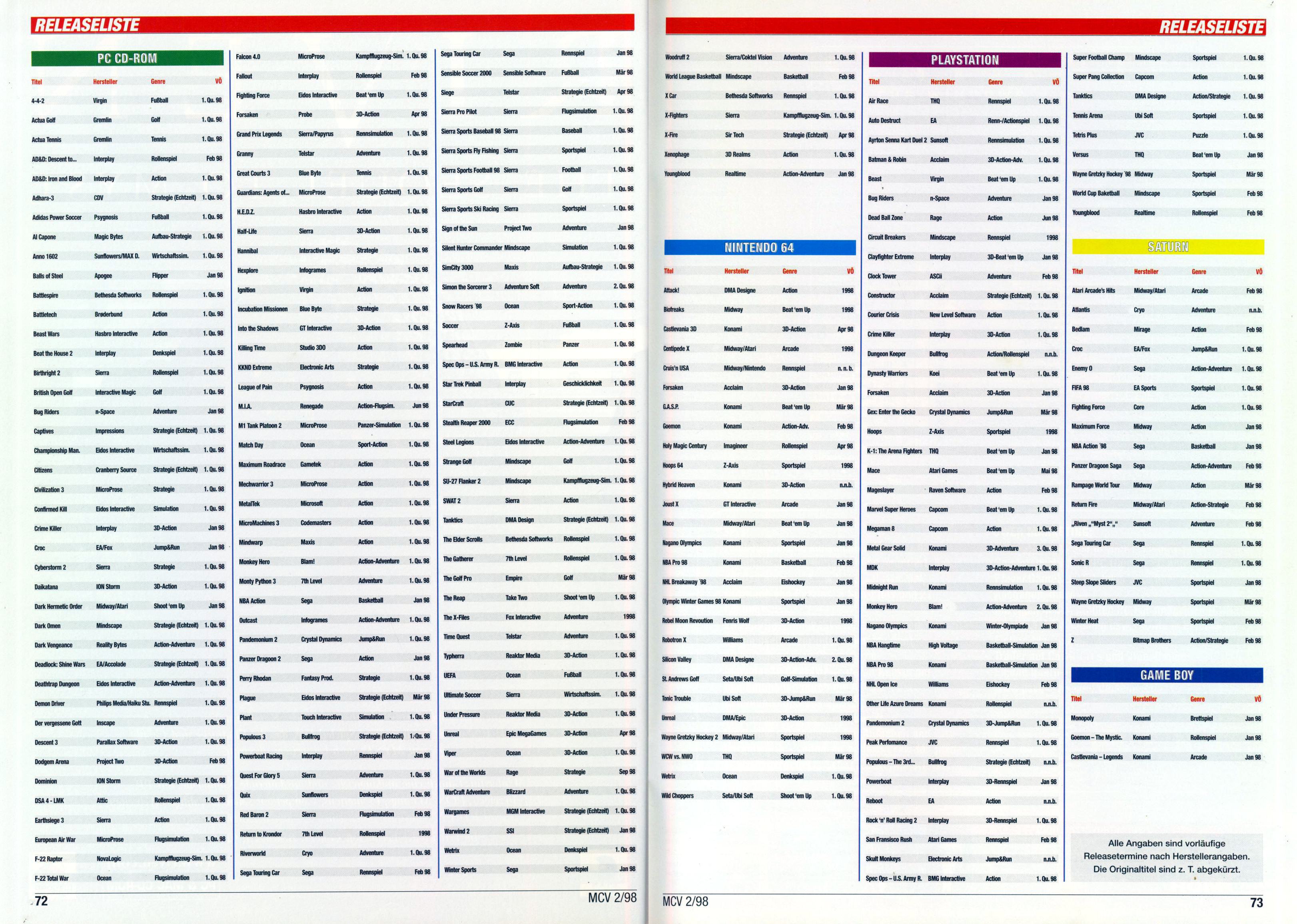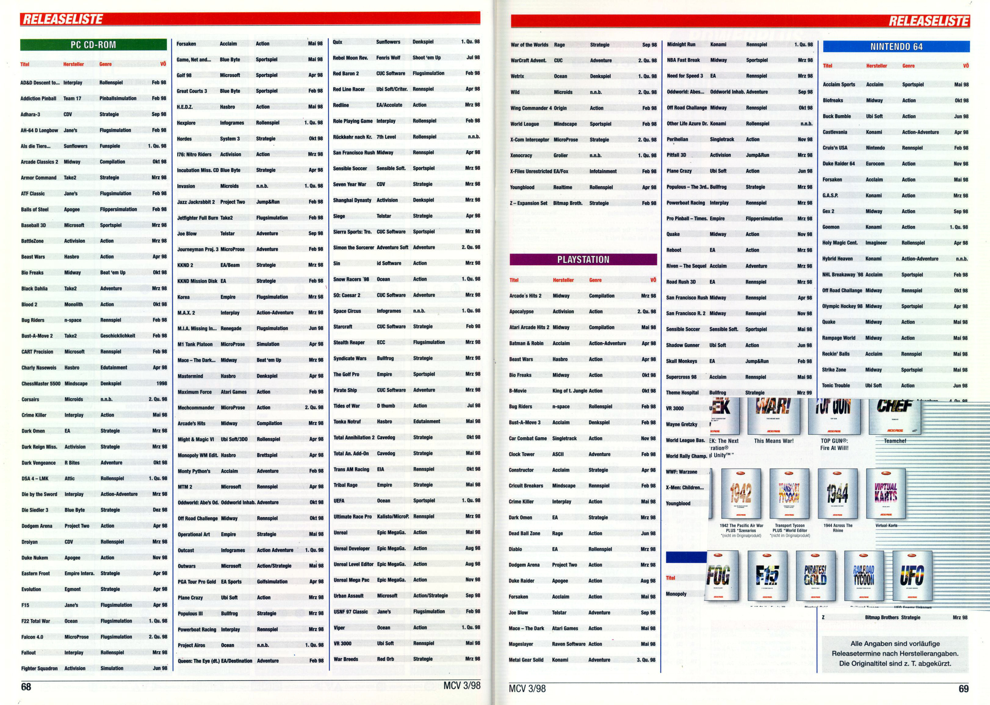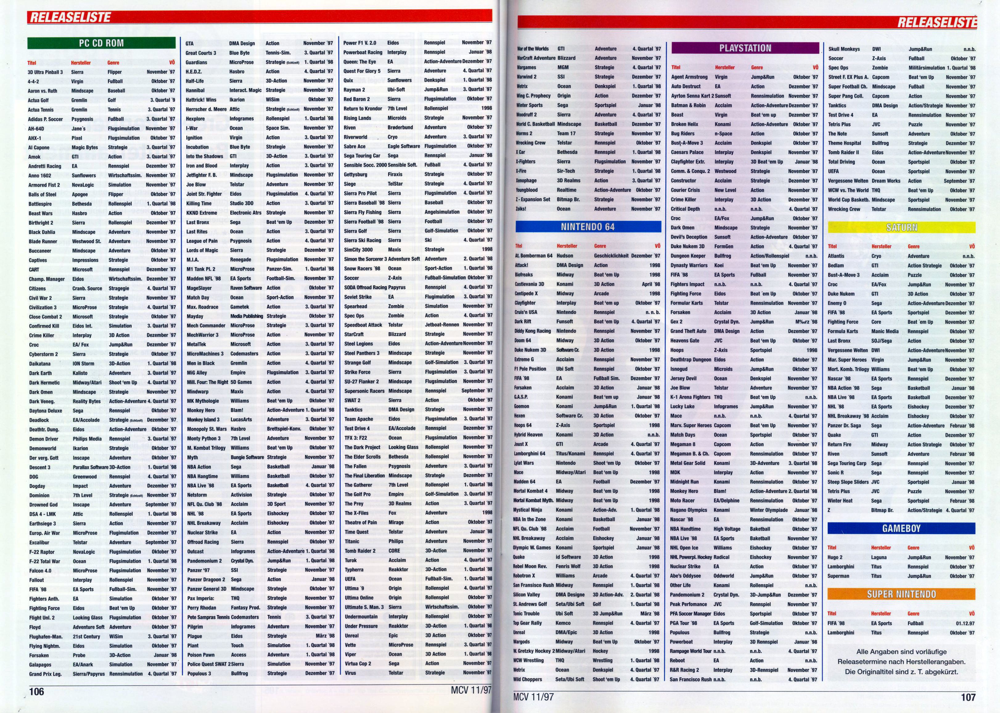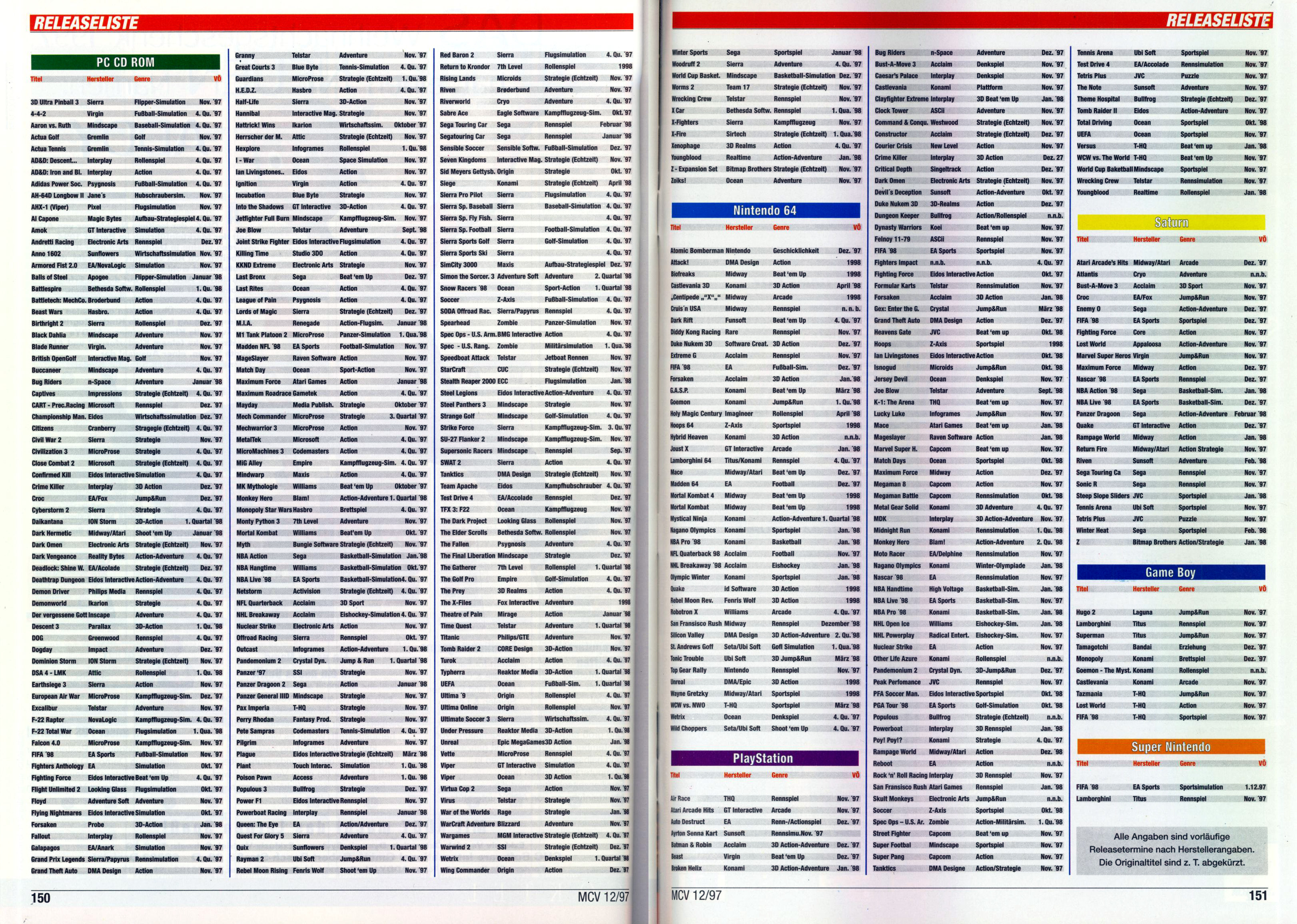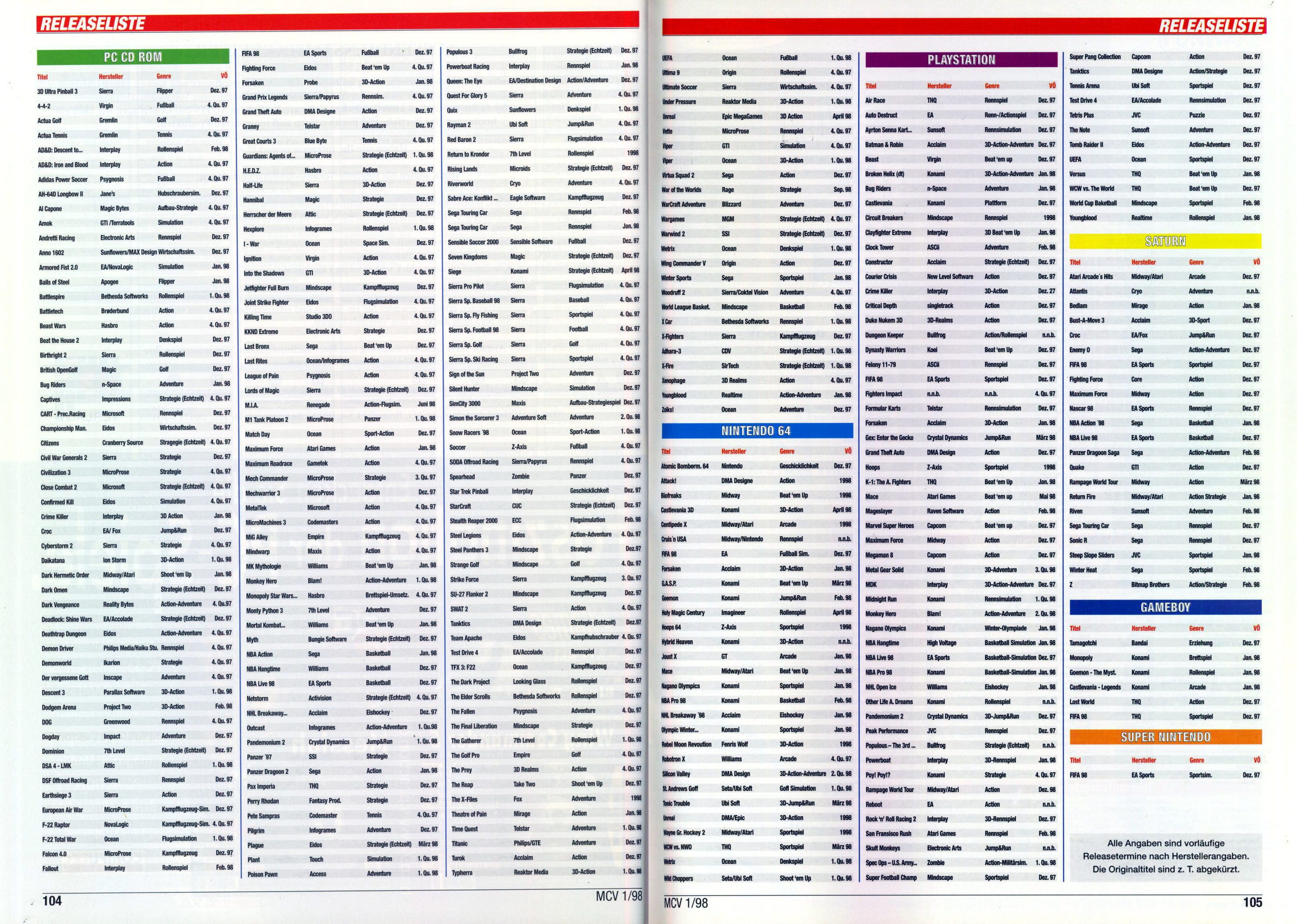 German PC and Video Game Release Lists 1997 and 1998